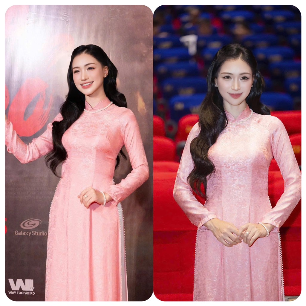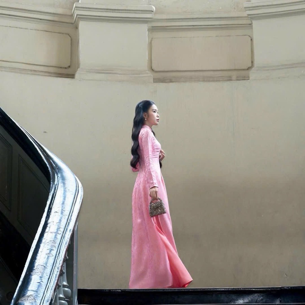 Với gam hồng dịu ngọt, mẫu áo dài này mang đến vẻ đẹp trẻ trung, nữ tính nhưng không kém phần sang trọng, giúp người mặc trở nên duyên dáng và nối bật trong mọi dịp.