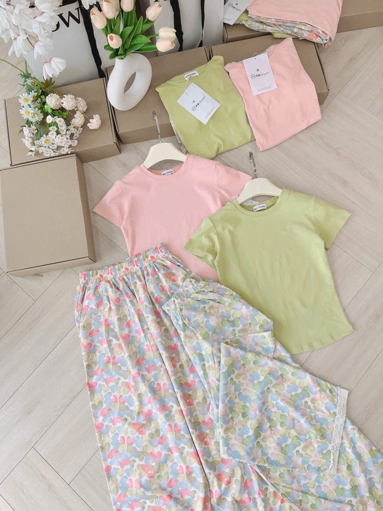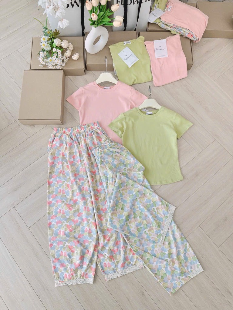 ☘️ BỘ QUẦN PHỐI REN MIX ÁO DÍP 🍀🌿Quần hoạ tiết pastel ngọt ngào cùng áo basic trơn, lên dáng xinh khỏi bàn 💕