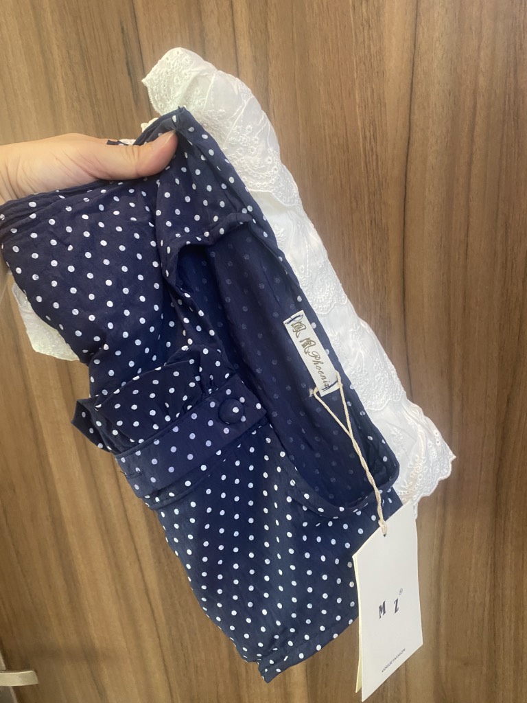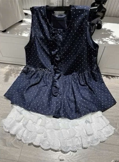Set áo chấm bi chân sát nách xanh than váy trắng qc cực hót ạ