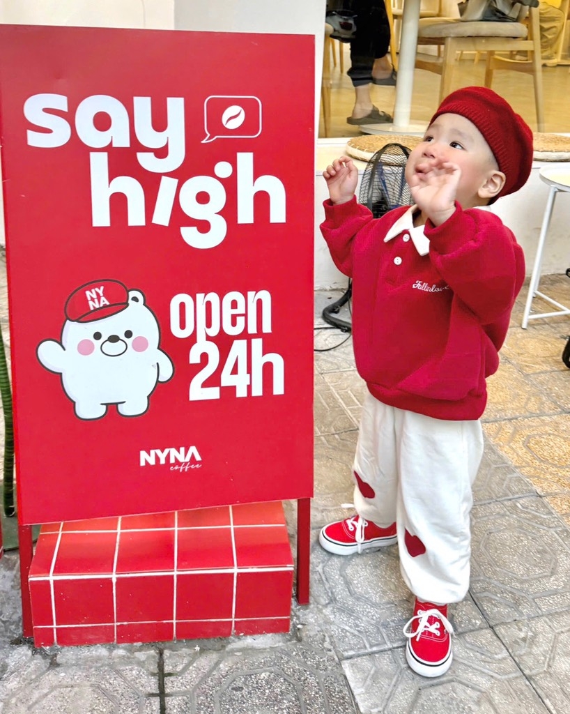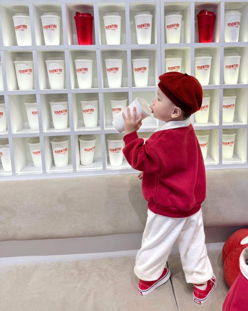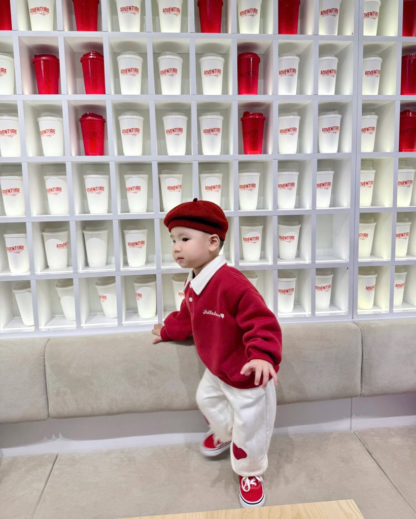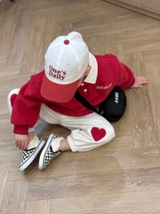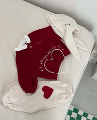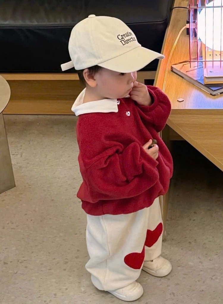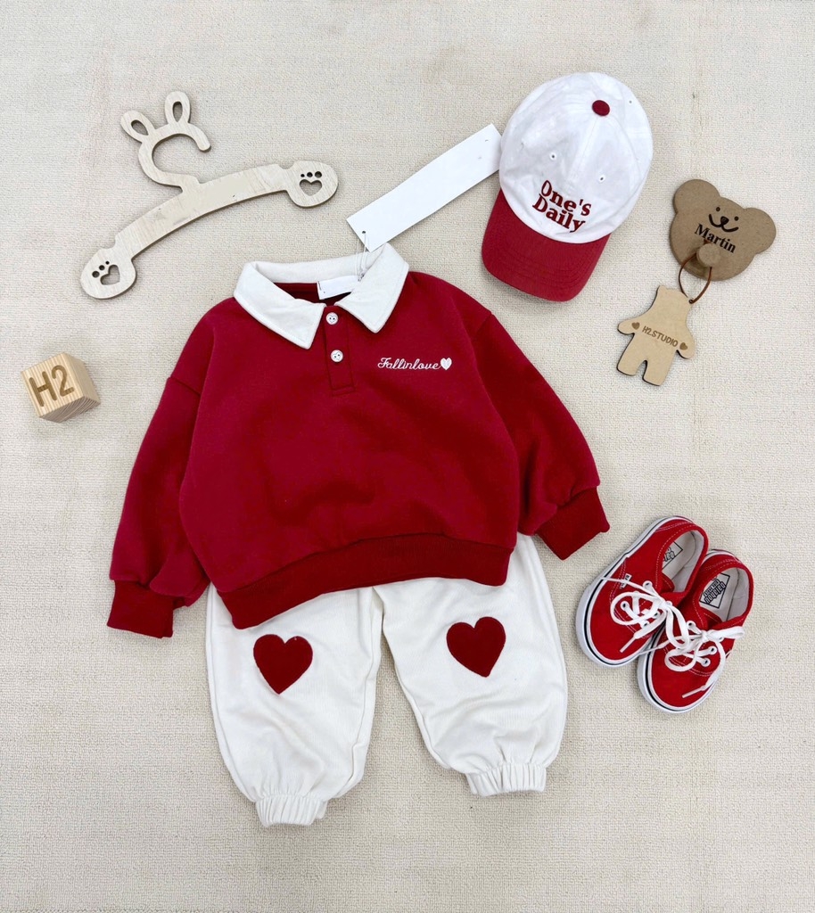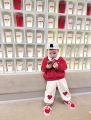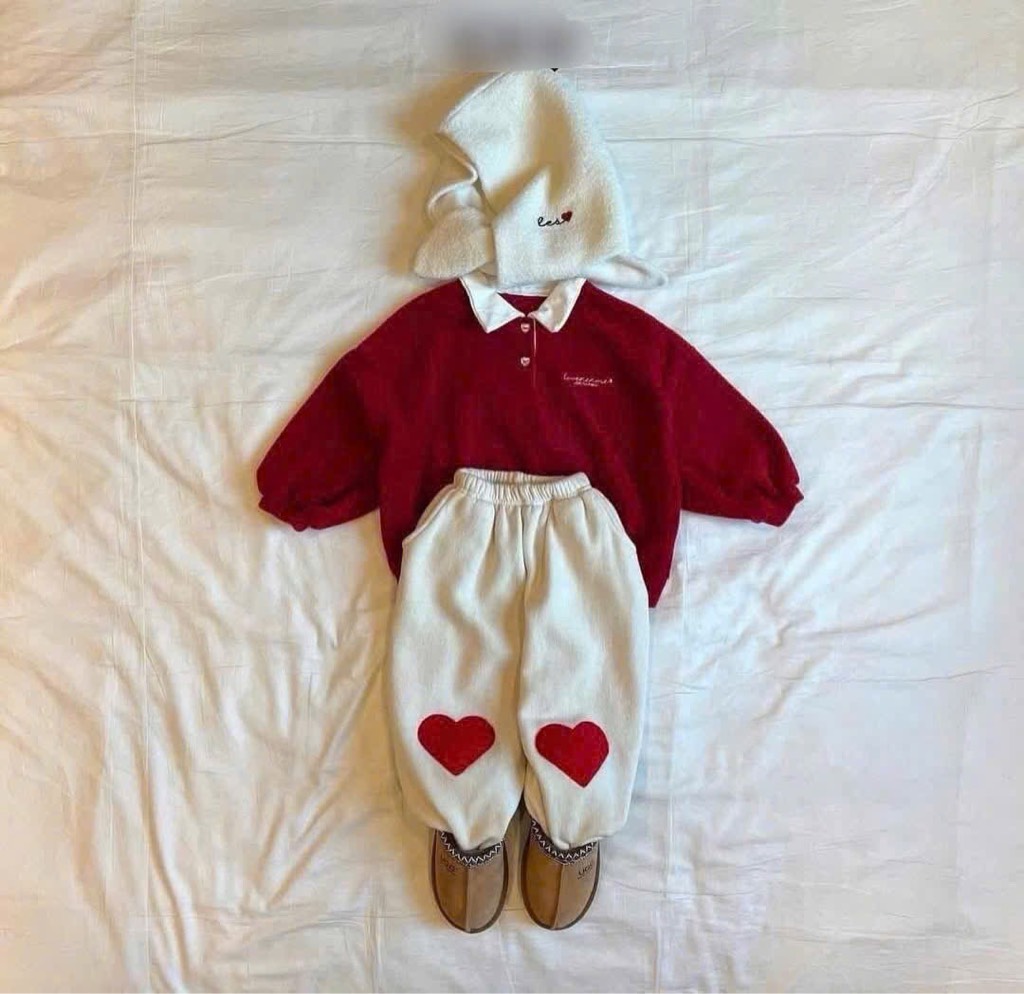Áo polo đỏ phối cổ trắng, quần nỉ trắng in trái tim đỏ ở gối, vừa dễ thương vừa ấm áp.