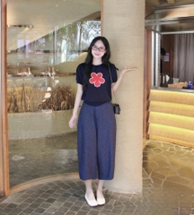 Áo họa tiết hoa đỏ nổi bật mix cùng quần ống rộng basic, vừa cá tính vừa tinh tế.