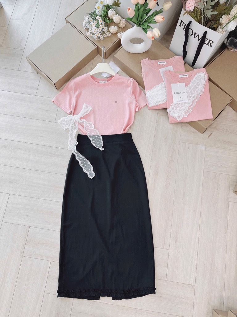 Tặng ren cổ điệu đà – mix chân váy dài đen basic chân bèo, nhẹ nhàng mà cực tôn dáng.