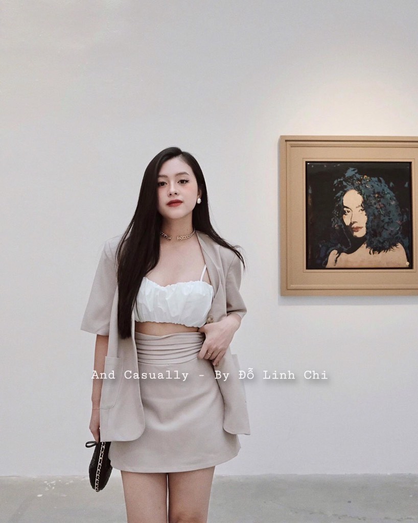Dáng vesst trẻ trung , nổi bật thêm ở phần chân váy có li , tạo điểm nhấn và định hình phom v2 cực đỉnh , trông minhon tức thì