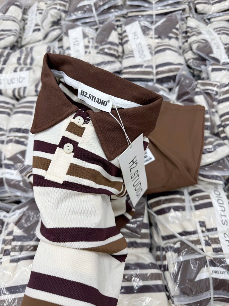 Áo polo cổ bẻ lịch sự, phối sọc ngang trẻ trung, quần kaki mềm mịn dễ mặc.