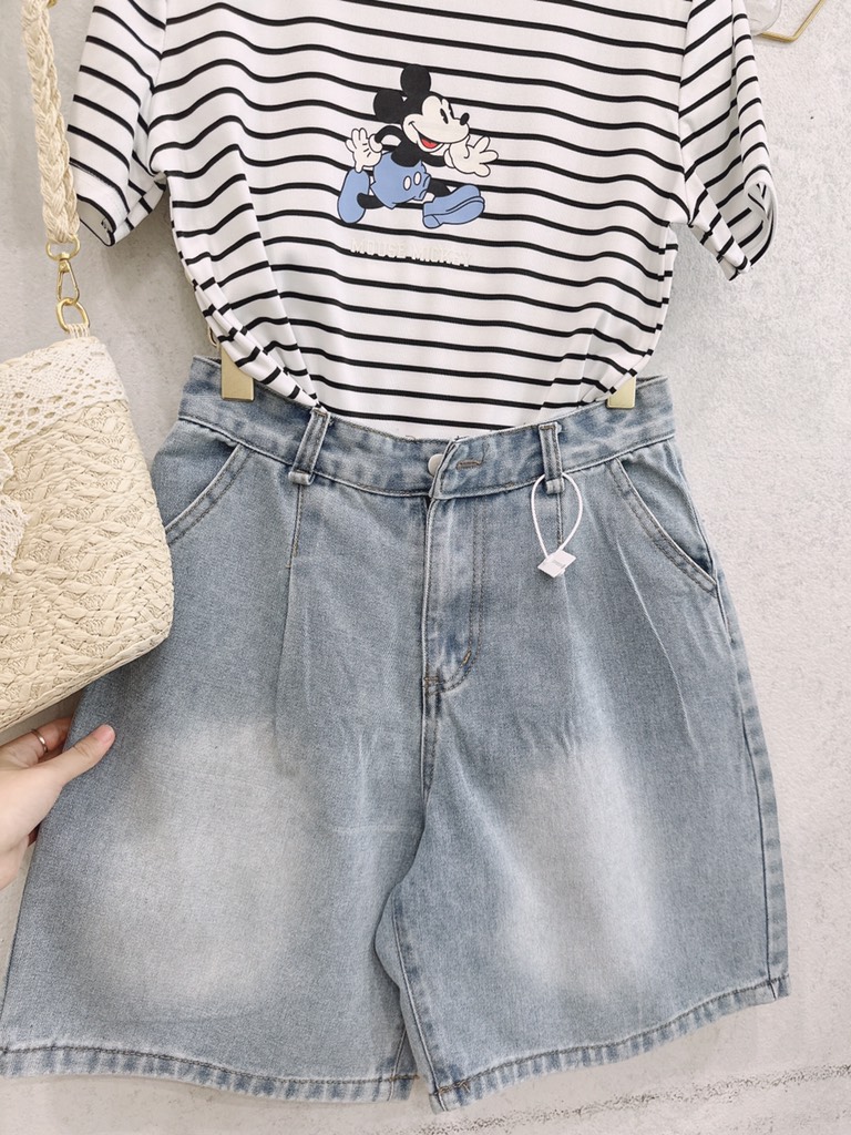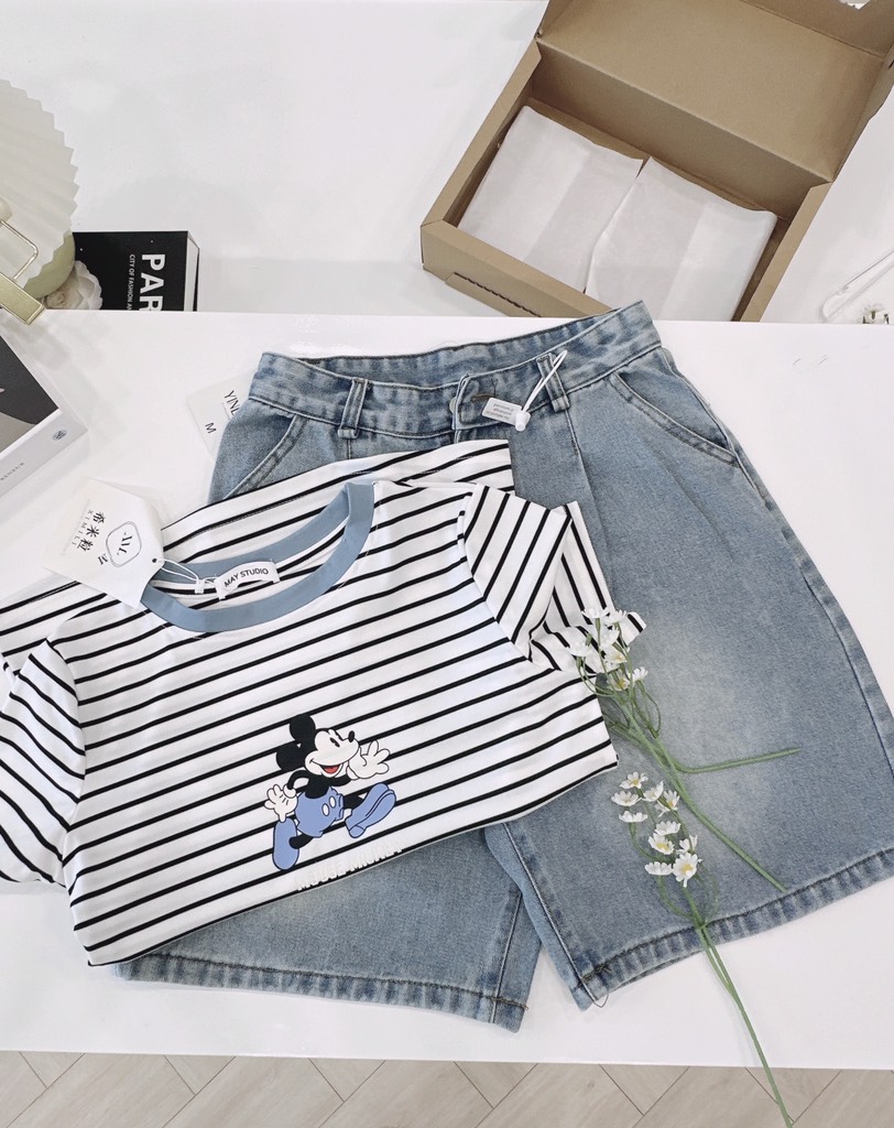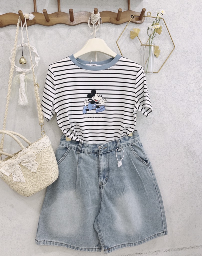 🌸 Set áo thun kẻ Mickey mix quần bò li mài bạc – combo trẻ trung + sành điệu khỏi bàn!