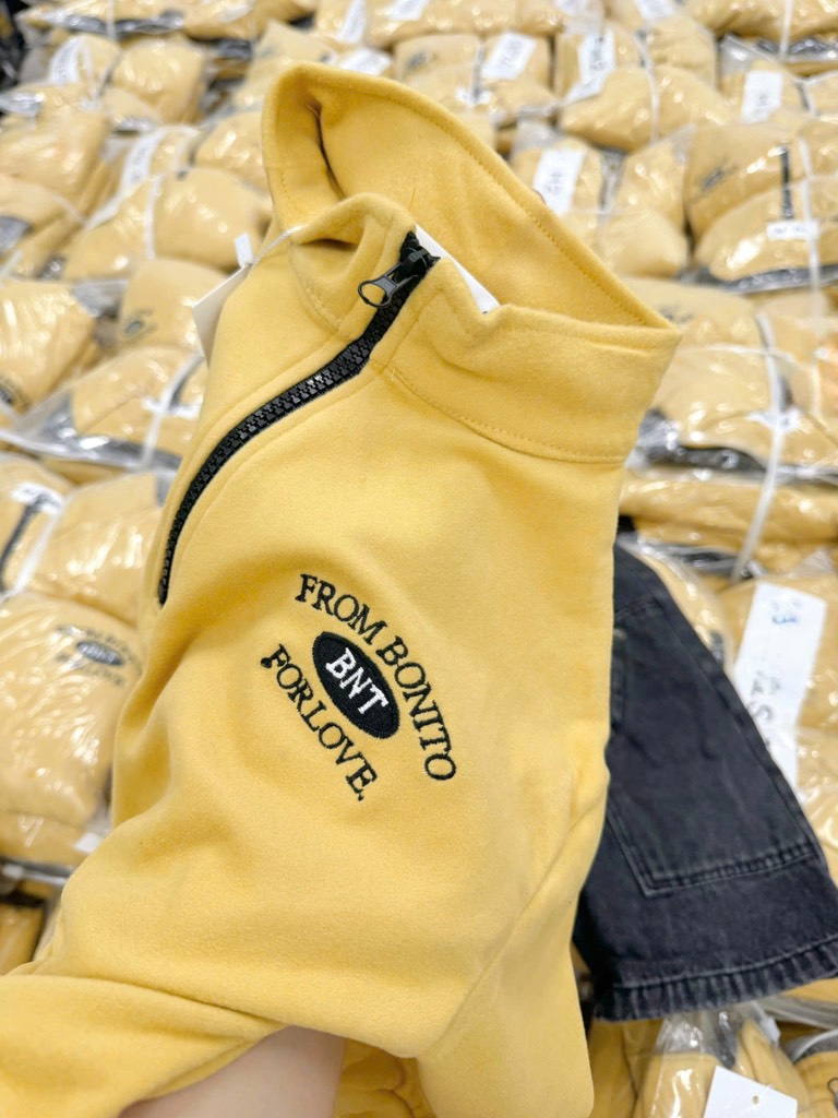 Áo nỉ cổ zip vàng tươi phối quần jean baggy đen chất cực xinh.