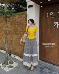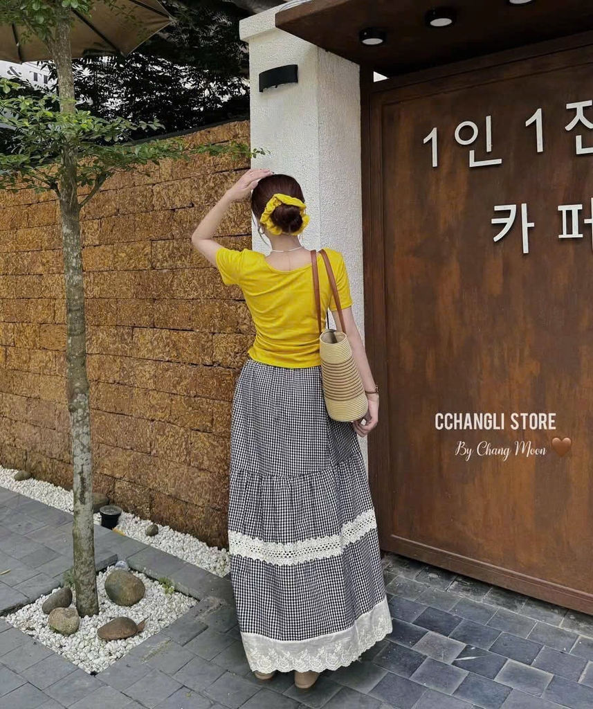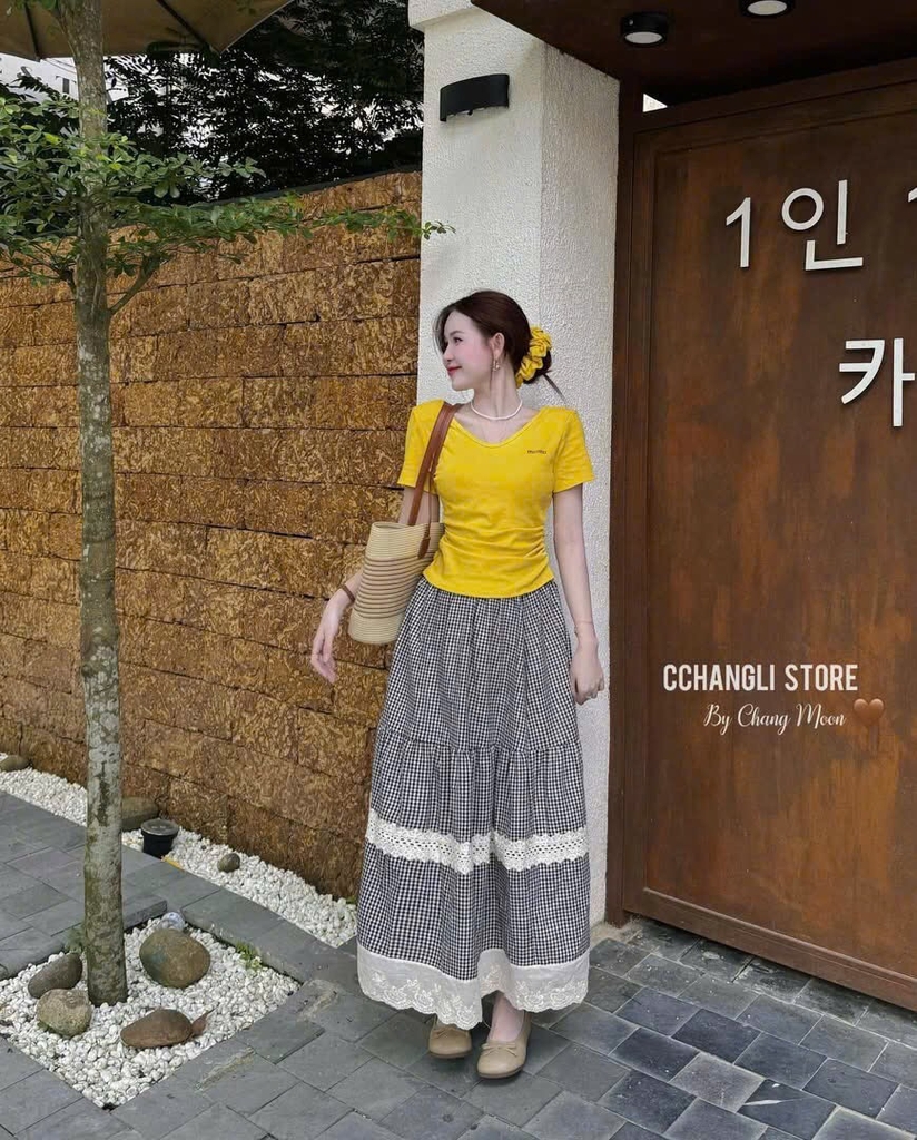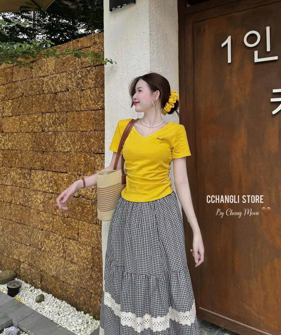 ☘️ SET BỘ NỮ ÁO COTTON VÀNG MIUMIU MIX CHÂN VÁY KẺ☘️
