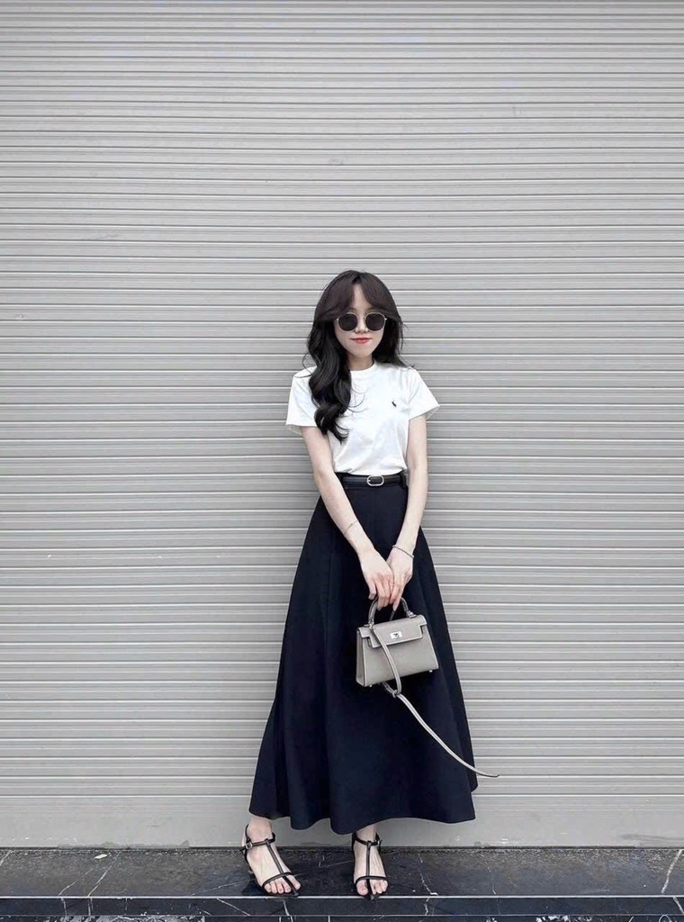 🌷Basic mà không hề đơn điệu – combo áo thun logo thêu phối cùng chân váy dài dáng xoè nhẹ, tôn dáng cực đỉnh.