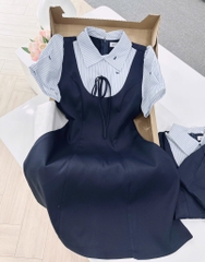 Chiếc váy “gây thương nhớ” bởi tone xanh than bassic , kết hợp cổ kẻ nơ đồng điệu – chuẩn style nàng thơ Paris.