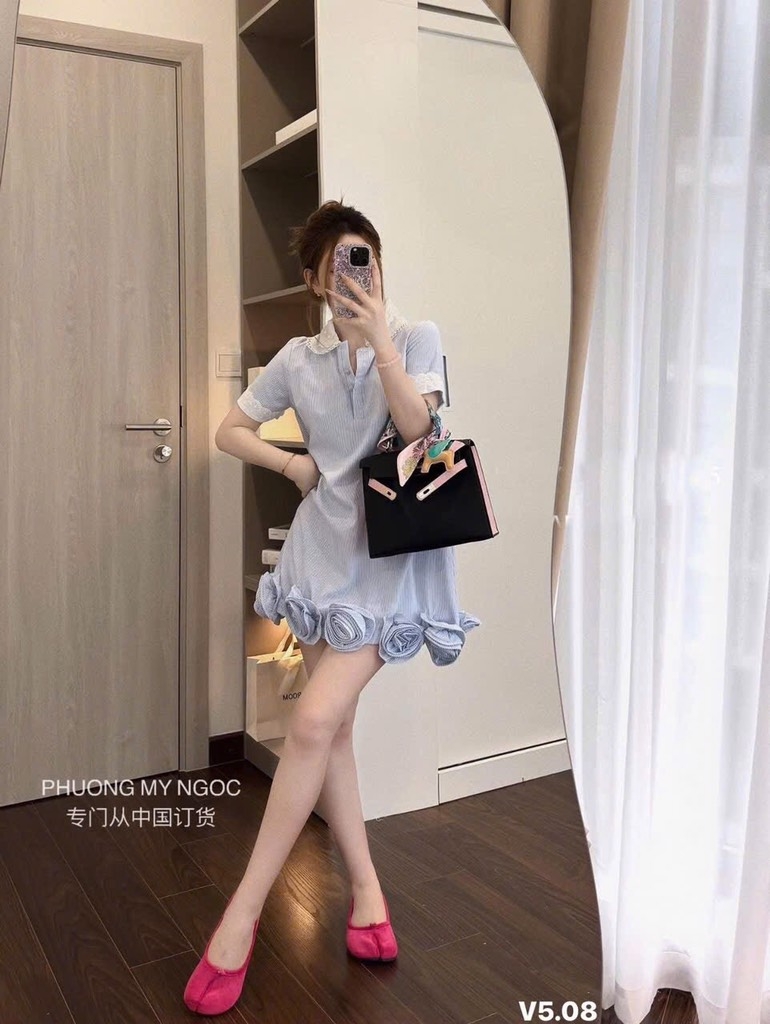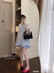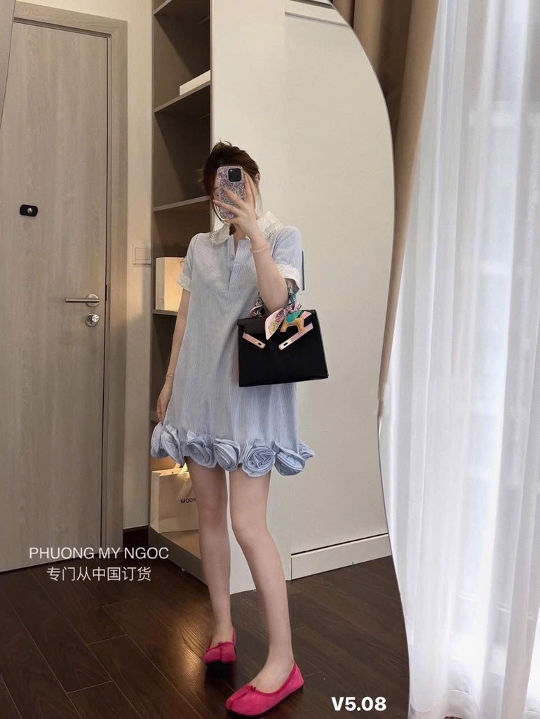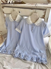 VÁY XANH KẺ CỔ SEN BÈO ĐÍNH HOA NỮ