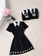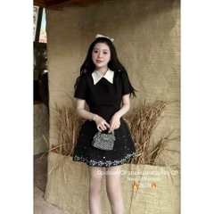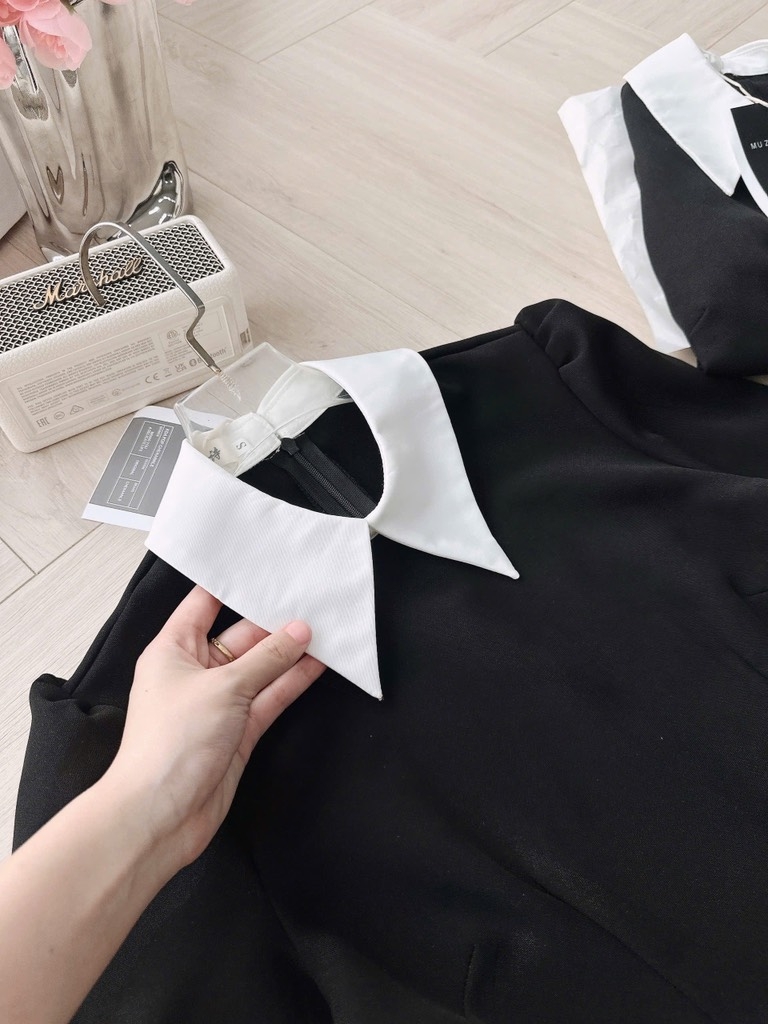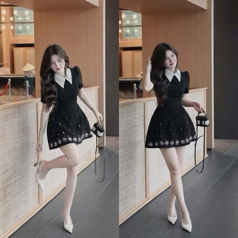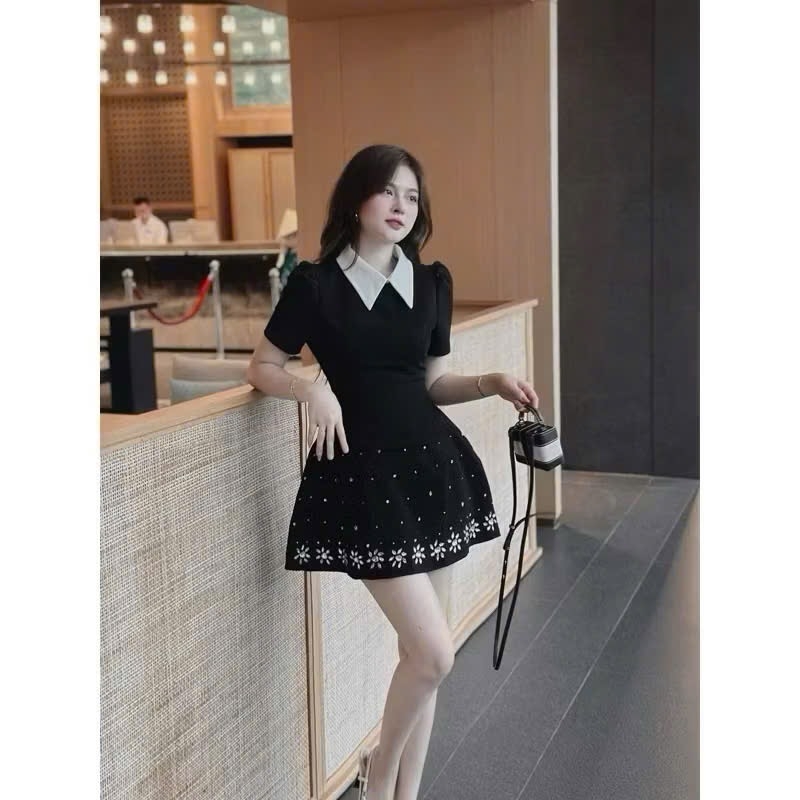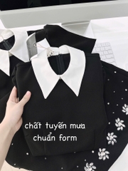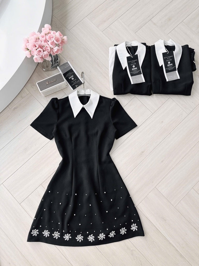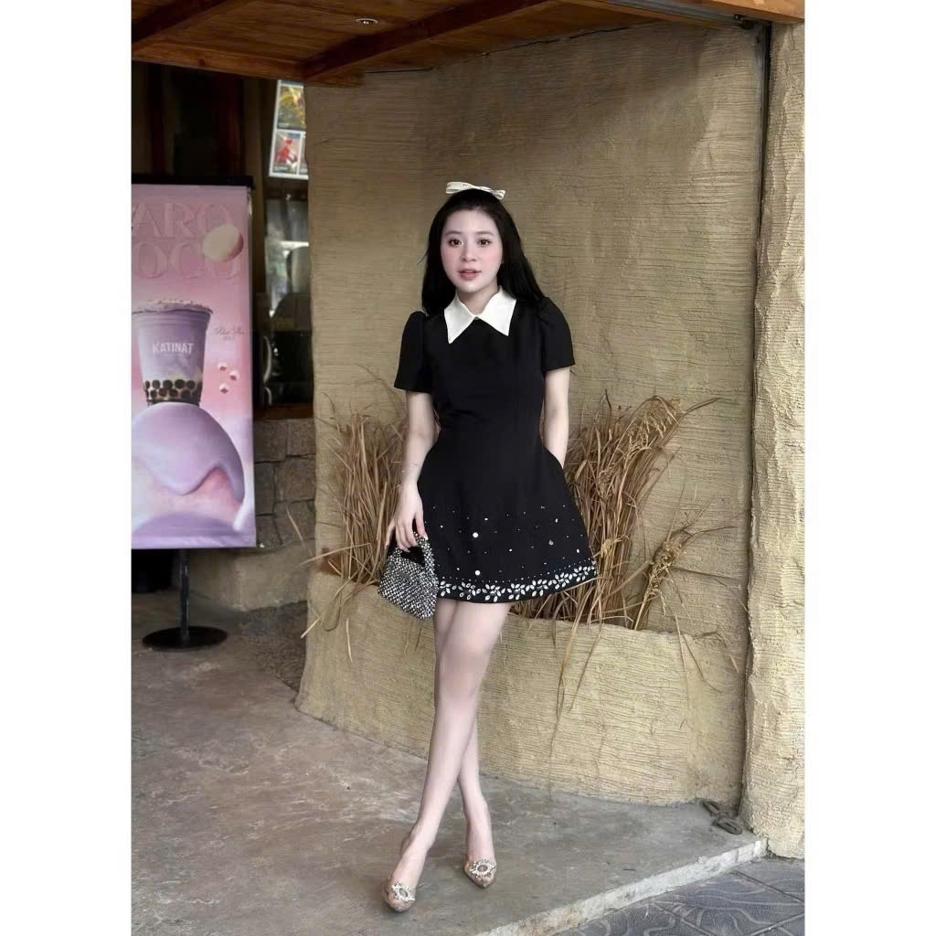 Thiết kế đầm đen sang trọng, cổ trắng nổi bật kết hợp chi tiết đính đá & hoa thêu thủ công, mang đến vẻ đẹp thanh lịch nhưng vẫn đầy cuốn hút!
